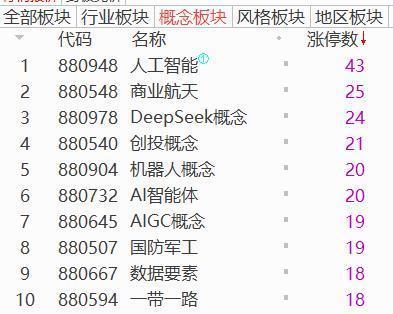 从板块来看,人工智能和商业航天继续狂飙,其中人工智能涨停43只,商业航天涨停25只。人工智能集体爆发,仅20CM涨停就有11只,引力传媒5天4板,省广集团、会畅科技、粤传媒、易点天下等涨停。商业航天概念反复活跃,鲁信创投11天9板,中国卫通9天5板,金风科技4连板,航天电子6天4板。